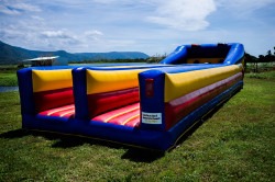 This fast-paced inflatable challenge is perfect for ages 10 and up. Two players compete side by side, strapped into bungee harnesses, and sprint down their lanes to place a Velcro baton as far as they can before the cord pulls them back. The player who sticks their baton the furthest wins! It’s a hilarious, high-energy game that’s perfect for parties, school events, and team-building days—always a crowd favourite and full of competitive fun!